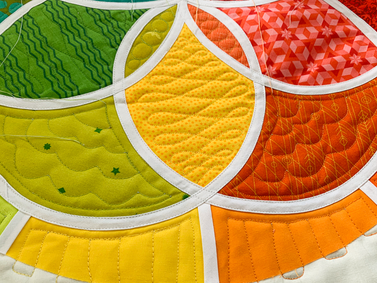I love it when quilts inspire the kind of free motion quilting designs I want to create. In this case, I chose varying designs for the different portions and it was so fun to play with new techniques including piano keys, scallops, ribbons and pebbles.
