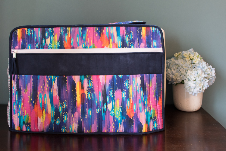 It has a big front pocket to hold patterns and my manual and side pockets which are perfect for my presser foot when I travel. The top opens with magnetic closures to allow me to access the carrying handle with the cover on.